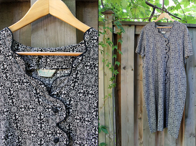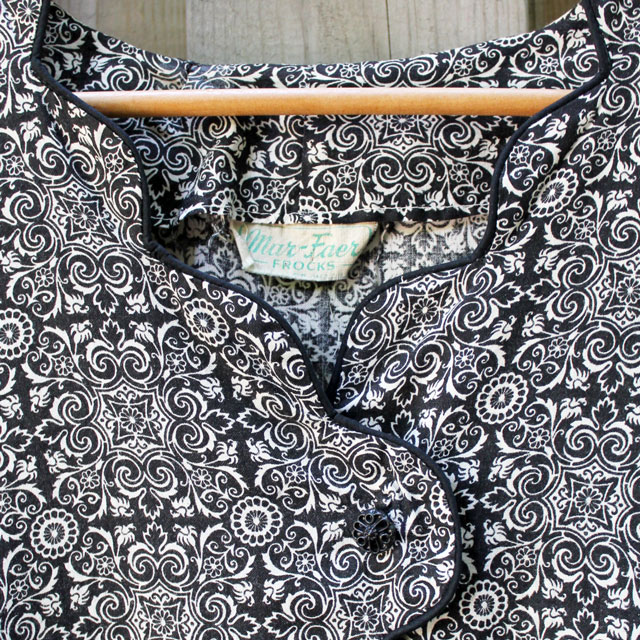 I came home with a dress from the 1940s, charmingly nicknamed Ginette. The tag says it was made by Mar Faer Frocks, for whom I can find no reference online. It is missing the original belt (I’m not surprised by that after 70+ years) but is in very good condition and even has a pocket.
