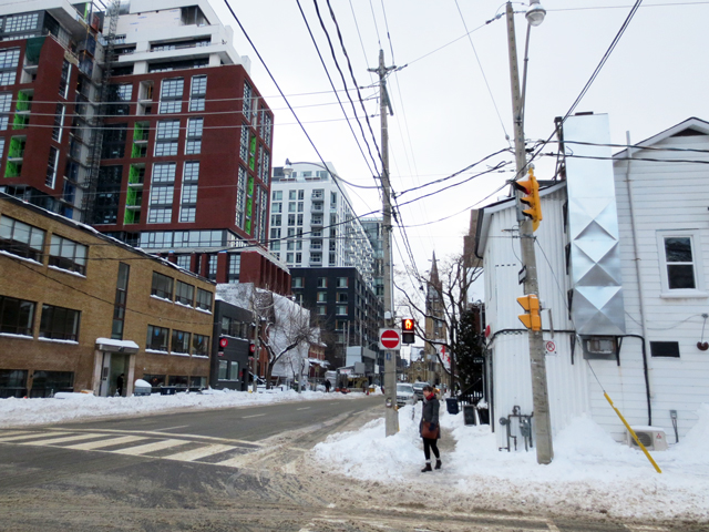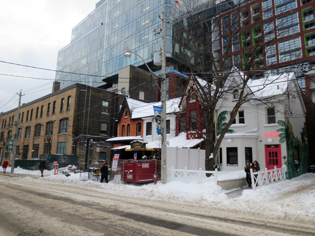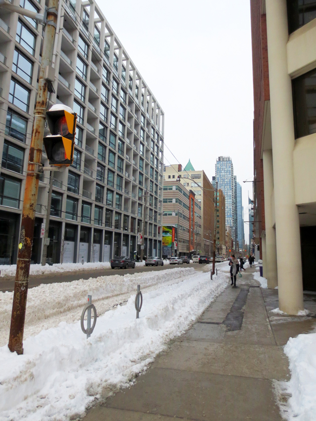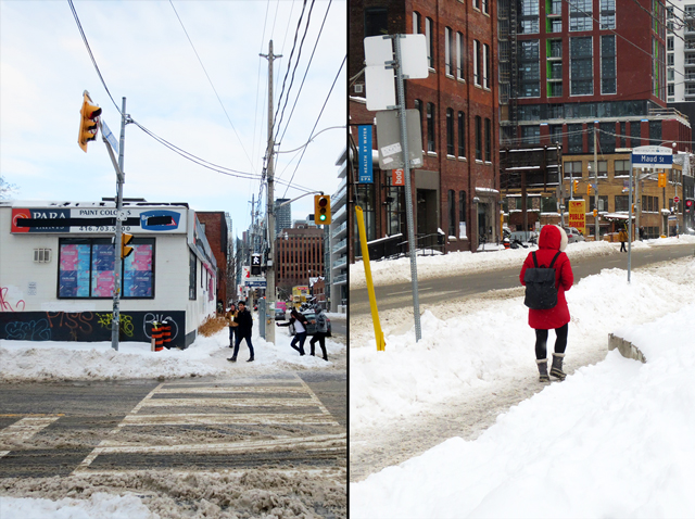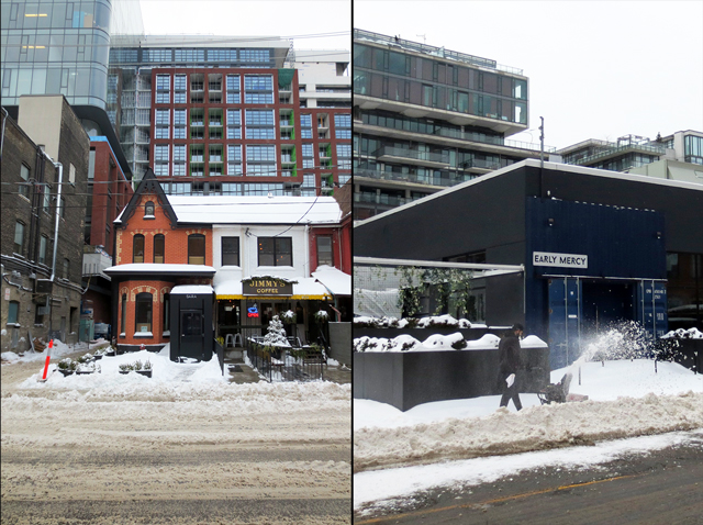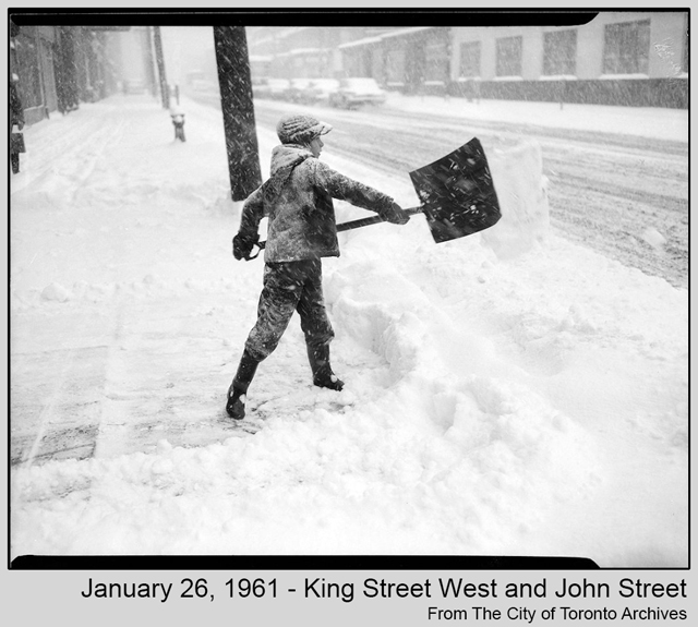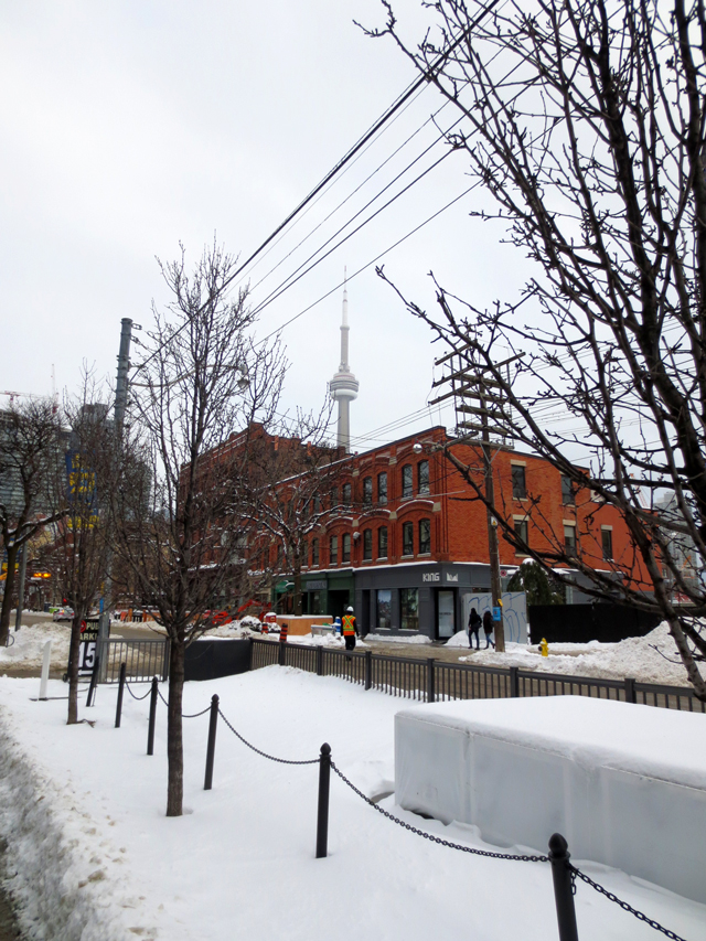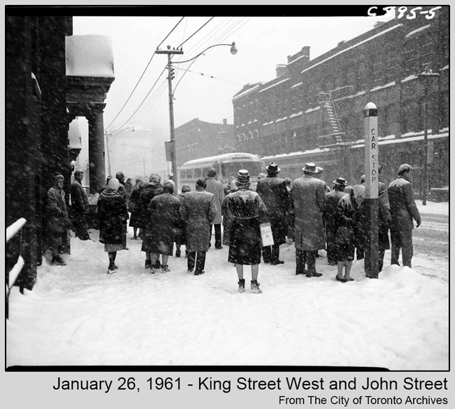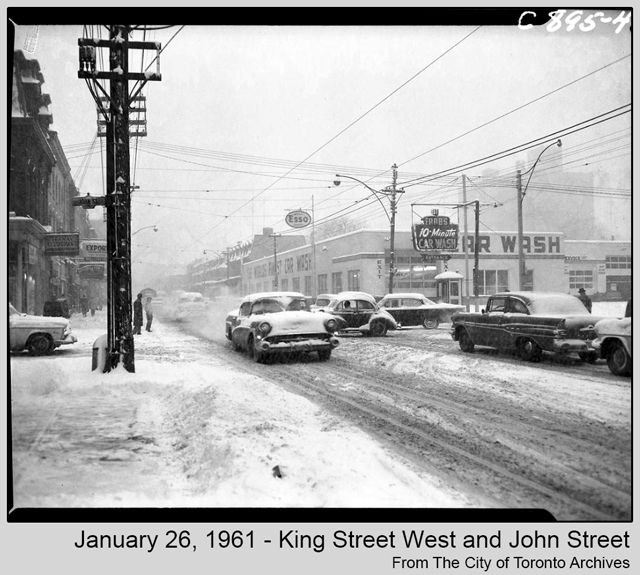 And, since we’ve looked at the recent snow situation on King Street West, this would be a good place to pop these cool historic photos of a snow storm that happened in Toronto 58 years ago. They’re taken at the corner of King Street West near John Street — the Esso Car Wash is on the site of today’s TIFF Theatre.