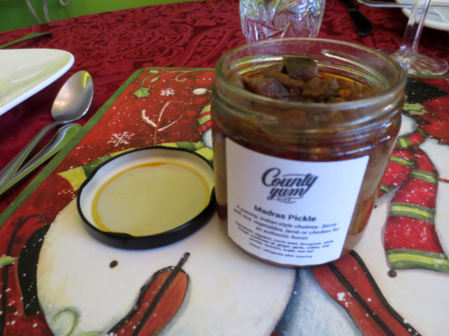 ↑ Leslie offered another delicious artisanal condiment to have with the meal, this one “Madras Pickle” by County Yum Club, also from Prince Edward County. (Sorry the shot is blurry, but I took it quickly so we could all get to the eating part!) ↑
